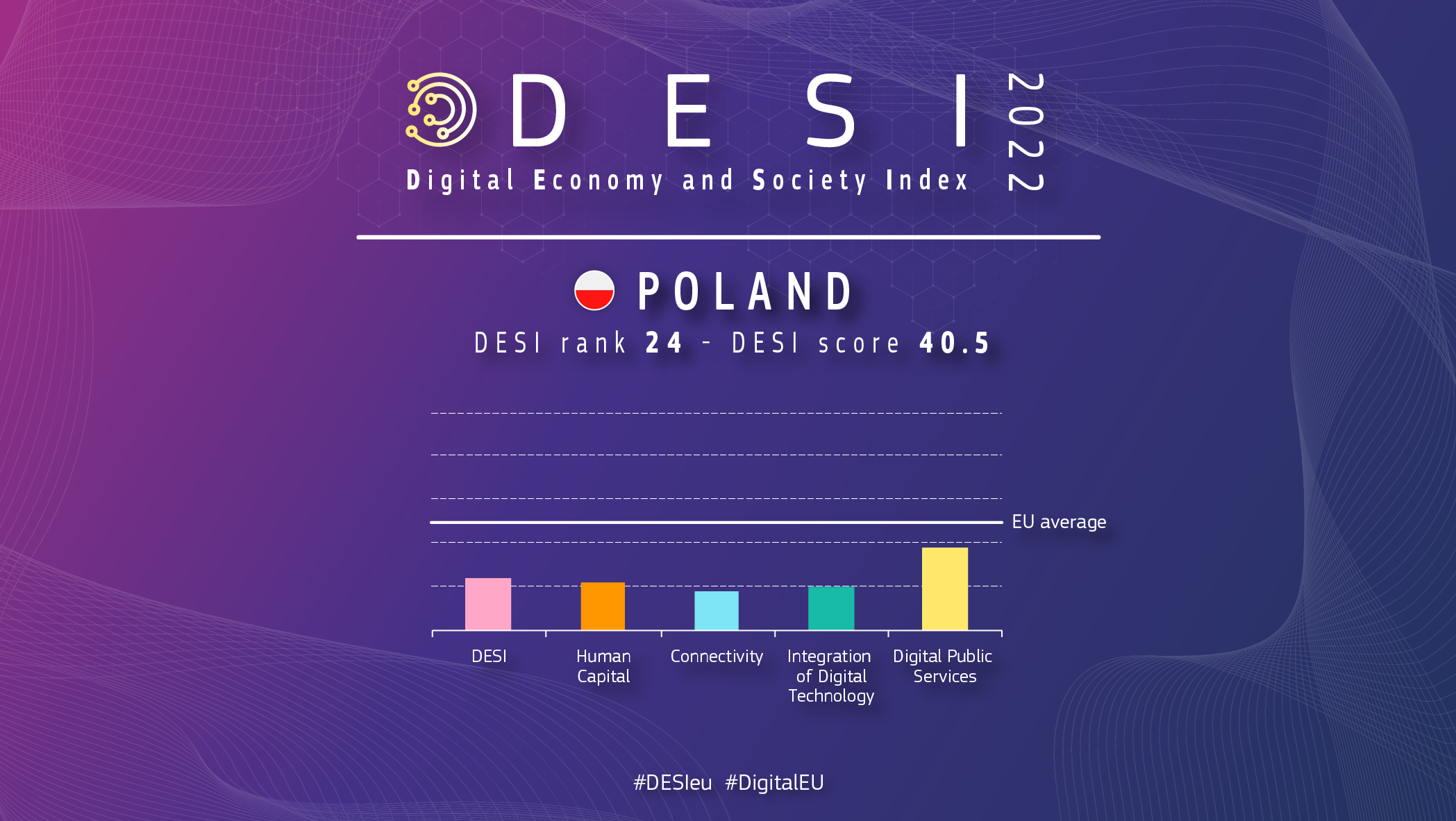 W najnowszym rankingu Polska plasuje się na 24 miejscu na 27 krajów. W latach 2017–2022 zagregowany wynik DESI w odniesieniu do Polski przekroczył jednak nieco unijną średnią, co świadczy o tym, że Polska nadrabia zaległości w stosunku do reszty UE.
